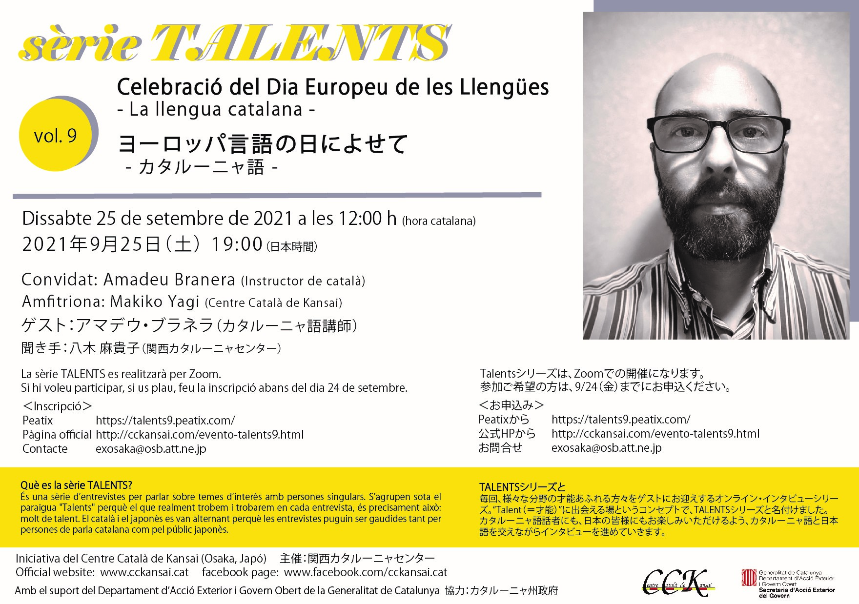 TALENTSシリーズでは、毎回、様々な分野の才能ある方々をゲストにお迎えして、オンラインでインタビューをしていきます。“Talent(=才能)”に出会える場、というコンセプトで名付けました。日本をはじめ世界中で生活しているカタルーニャ語話者にも、日本の皆様にも、お楽しみいただけるような内容でお届けしていきたいという思いから、ゲストとインタビュアーが、それぞれの母国語で話すというチャレンジングな試みに挑戦します。普段あまり知る機会のない、世界で活躍する方々のインタビューをぜひお楽しみください。