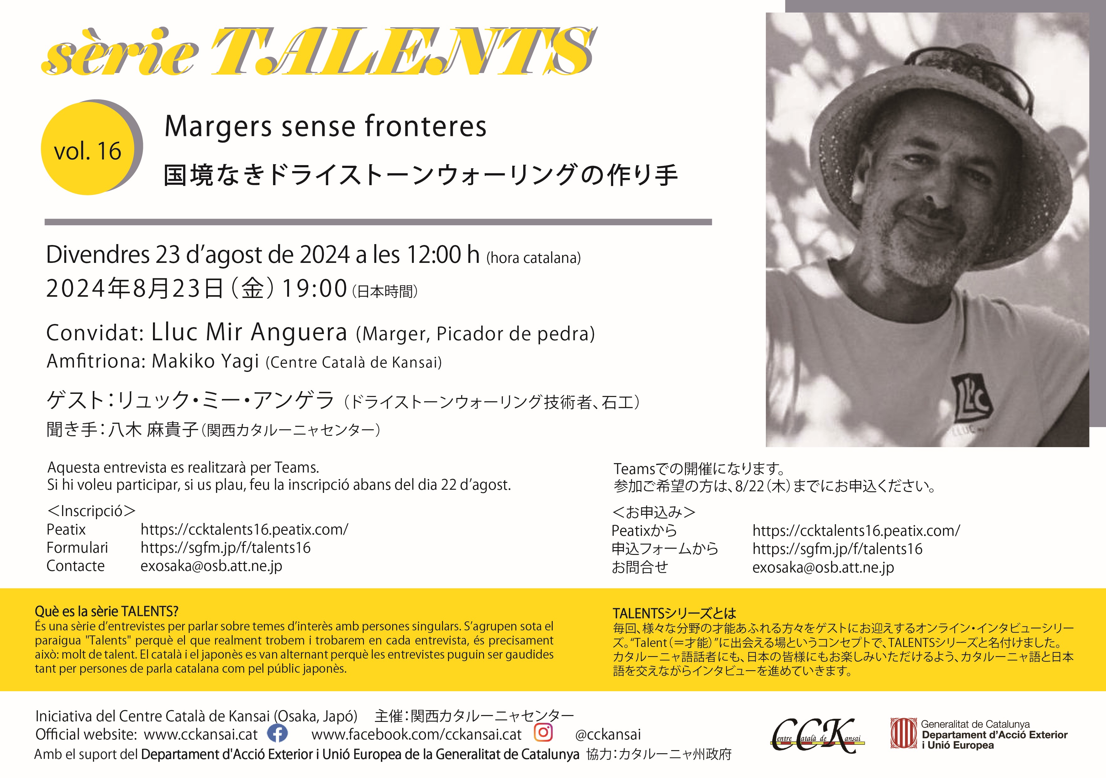 毎回、様々な分野の才能あふれる方々をゲストにお迎えするオンライン・インタビューシリーズ。「Talent(=才能)」に出会える場というコンセプトで、TALENTSシリーズと名付けました。カタルーニャ語話者にも、日本の皆様にもお楽しみいただけるよう、カタルーニャ語と日本語を交えながらインタビューを進めていきます。